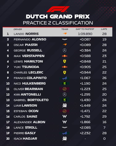 Lando Norris (McLaren) a signé son deuxième meilleur temps de la journée à Zandvoort, devançant ainsi Fernando Alonso (Aston Martin) et son coéquipier Oscar Piastri.