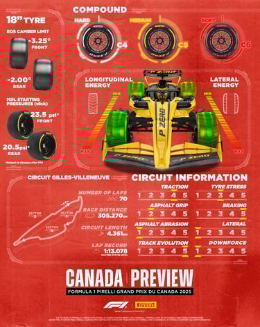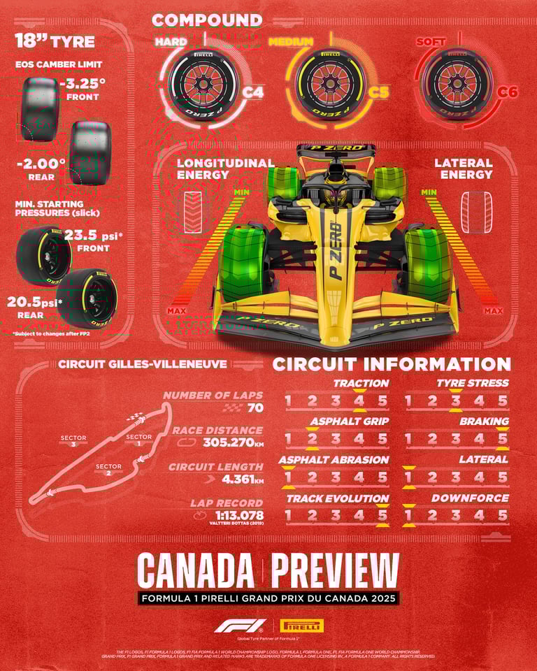 Contrairement au circuit de Barcelona-Catalunya, le tracé canadien n’est pas abrasif pour les pneumatiques. Ce week-end, Pirelli apportera ses gommes les plus tendres (C4, C5 et C6).